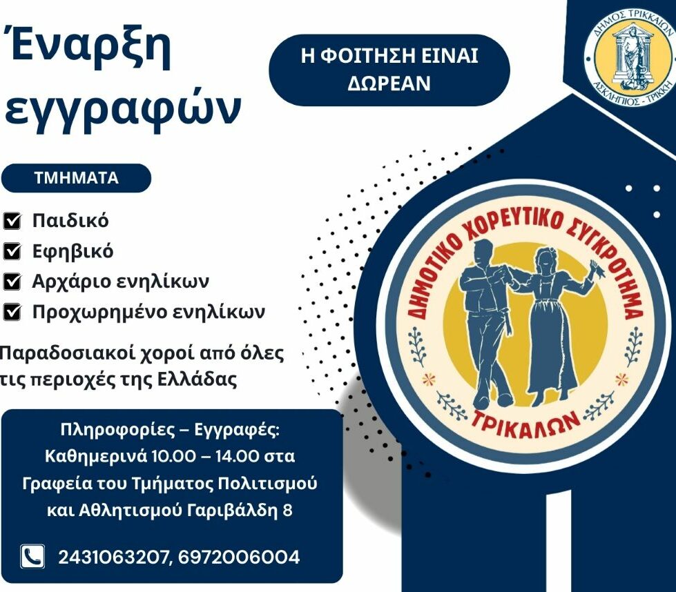 Με πρόσθετη διάθεση για προσφορά, για χορό, για έρευνα της πολιτιστικής παράδοσης του τόπου μας το Δημοτικό Χορευτικό Συγκρότημα του Δήμου Τρικκαίων ξεκινά τη νέα χρονιά 2025-26. Οι εγγραφές αφορούν στα νέα μέλη, που θα βρεθούν κοντά σε όσους και όσες ήδη αποτελούν πρεσβευτή ολόκληρης της πολιτιστικής παράδοσης των Τρικάλων, από κάθε γωνιά, σε κάθε της έκφραση.