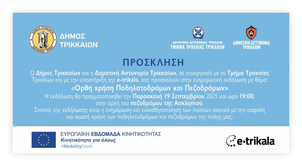 Παράλληλα, στη διάρκεια δύο ημερών, στις 19 και 20 Σεπτεμβρίου, ο Δήμος Τρικκαίων συνεργάζεται με την Περιφέρεια Θεσσαλίας, που επίσης υλοποιεί σειρά δράσεων για την Εβδομάδα Κινητικότητας (κυκλοφοριακή αγωγή, ενημέρωση, οικολογικό αποτύπωμα, ζωγραφική, παραποτάμια διαδρομή κ.α.).