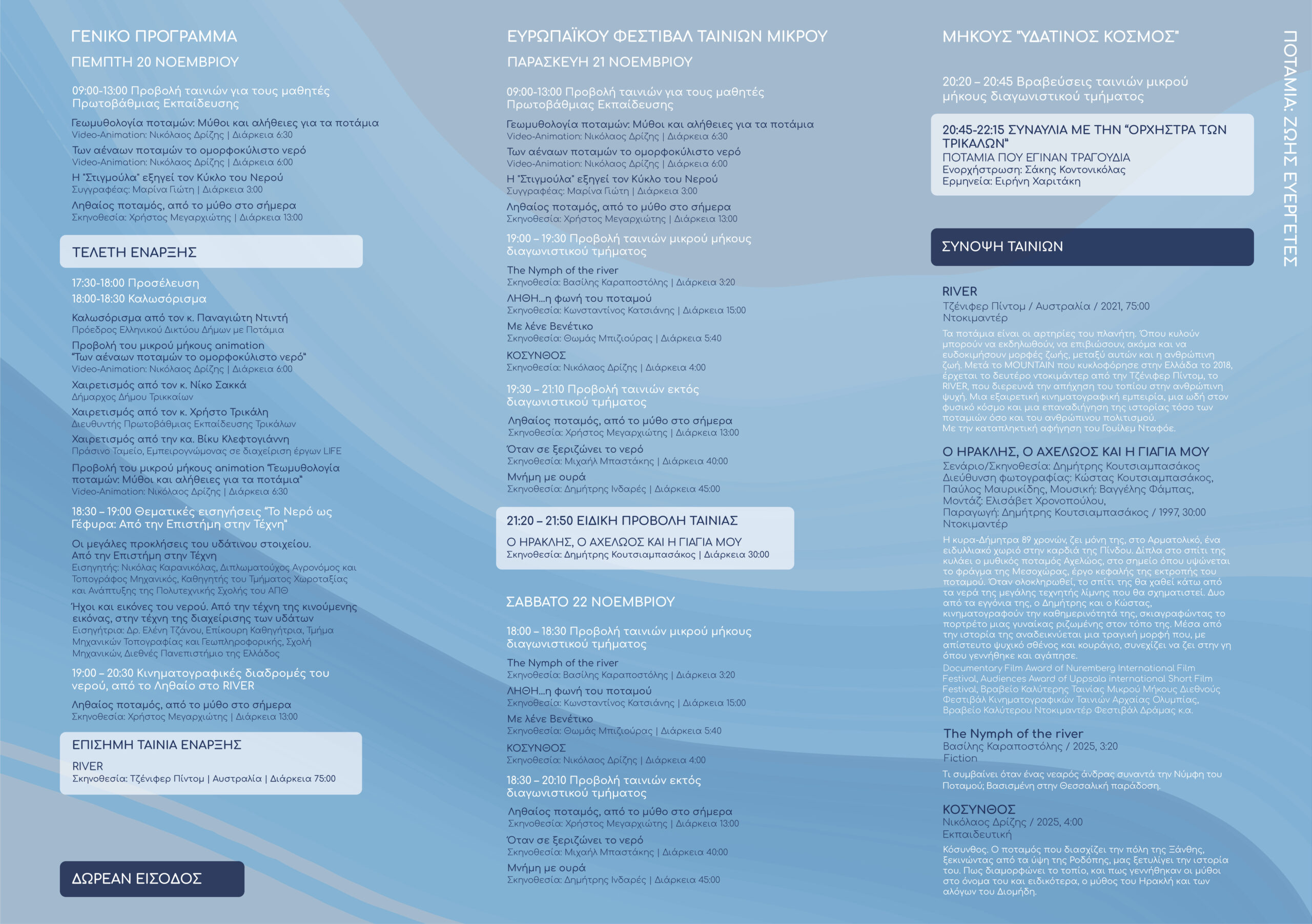 Το Ελληνικό Δίκτυο Δήμων με Ποτάμια, σε συνεργασία με τον Δήμο Τρικκαίων και χρηματοδότηση του Πράσινου Ταμείου, ανοίγει επίσημα στα Τρίκαλα από τις 20 έως τις 23 Νοεμβρίου 2025 τις πύλες του Ευρωπαϊκού Φεστιβάλ Ταινιών Μικρού Μήκους “Υδάτινος Κόσμος”.