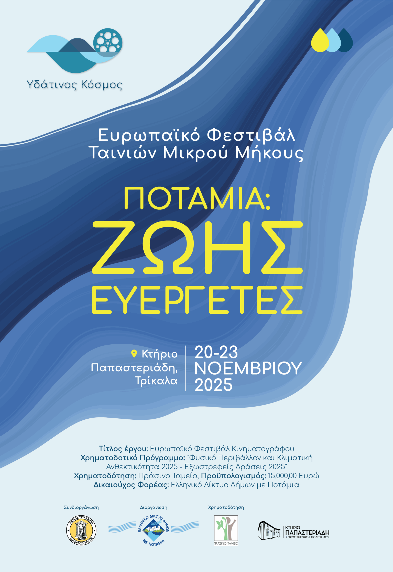 Το Ελληνικό Δίκτυο Δήμων με Ποτάμια, σε συνεργασία με τον Δήμο Τρικκαίων και χρηματοδότηση του Πράσινου Ταμείου, ανοίγει επίσημα στα Τρίκαλα από τις 20 έως τις 23 Νοεμβρίου 2025 τις πύλες του Ευρωπαϊκού Φεστιβάλ Ταινιών Μικρού Μήκους “Υδάτινος Κόσμος”.
