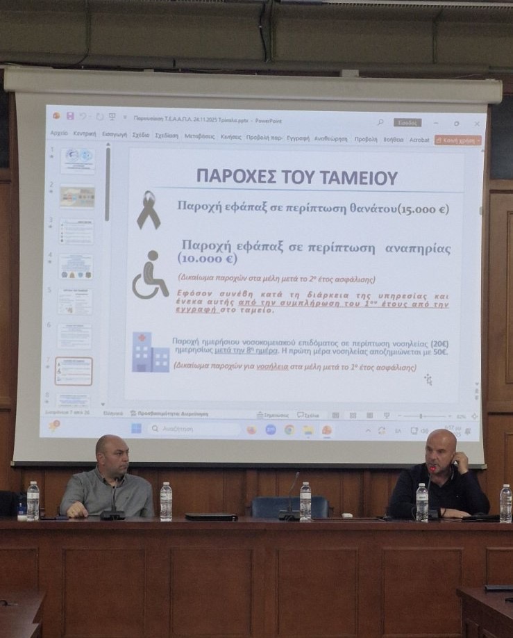 Την Δευτέρα 24 Νοεμβρίου 2025, στην αίθουσα του Δημοτικού Συμβουλίου του Δήμου Τρικκαίων, πραγματοποιήθηκε με επιτυχία ενημερωτική ημερίδα σχετικά με το Ταμείο Επαγγελματικής Ασφάλισης Αστυνομικών, Πυροσβεστών και Λιμενικών (Τ.Ε.Α.Α.Π.Λ.) την οποία διοργάνωσαν από κοινού η Ένωση Αστυνομικών Υπαλλήλων Τρικάλων και η Τοπική Διοίκηση Τρικάλων της Διεθνούς Ενώσεως Αστυνομικών (I.P.A.).