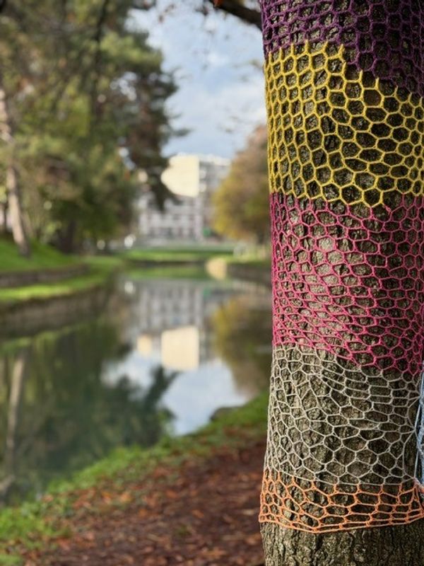 Τα πλεκτά έργα δημιουργήθηκαν στο πλαίσιο δημιουργικής δράσης με τη συμμετοχή παιδιών, τα οποία με ενθουσιασμό, φαντασία και συνεργασία έπλεξαν κομμάτια γεμάτα χρώμα και συναίσθημα. Στη συνέχεια, τα έργα τοποθετήθηκαν στους κορμούς των δέντρων, προσφέροντας μία εικόνα χαράς και ζεστασιάς σε όσους περνούν από το σημείο.