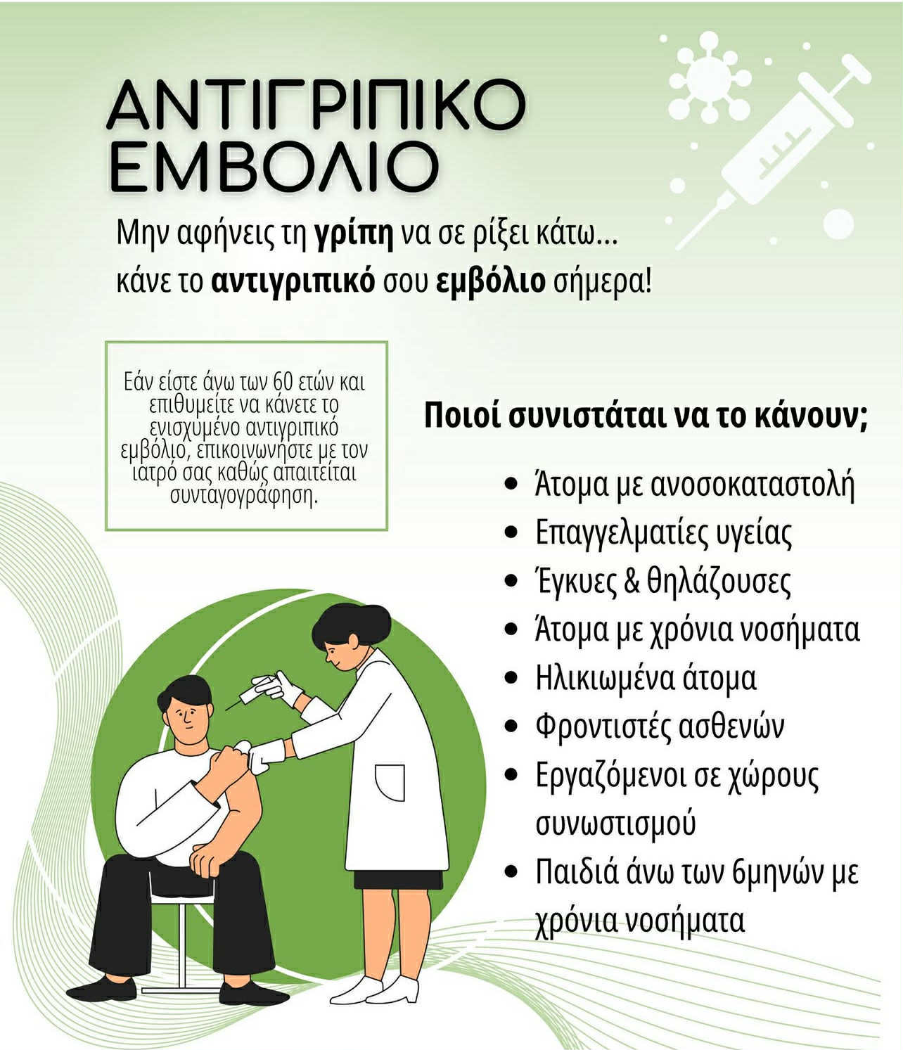 Σύμφωνα με το Εθνικό Πρόγραμμα Εμβολιασμών, ο εμβολιασμός κατά της εποχικής γρίπης συστήνεται ιδιαίτερα για τα άτομα ηλικίας 60 ετών και άνω, τα βρέφη και παιδιά 6 μηνών έως 5 ετών, τα παιδιά άνω των 5 ετών και τους ενήλικες με χρόνια νοσήματα ή επιβαρυντικούς παράγοντες, τις εγκυμονούσες, λεχωΐδες και θηλάζουσες, τα άτομα με νοσογόνο παχυσαρκία, τα παιδιά που λαμβάνουν μακροχρόνια ασπιρίνη, τα άτομα που φροντίζουν βρέφη ή ασθενείς με υποκείμενα νοσήματα. Επιπλέον, συστήνεται ιδιαιτέρως σε κλειστούς πληθυσμούς, εργαζόμενους στον χώρο της υγείας και σε κέντρα διαμονής προσφύγων, αστέγους, καθώς και όσους έρχονται σε τακτική επαφή με ζώα υψηλού κινδύνου.