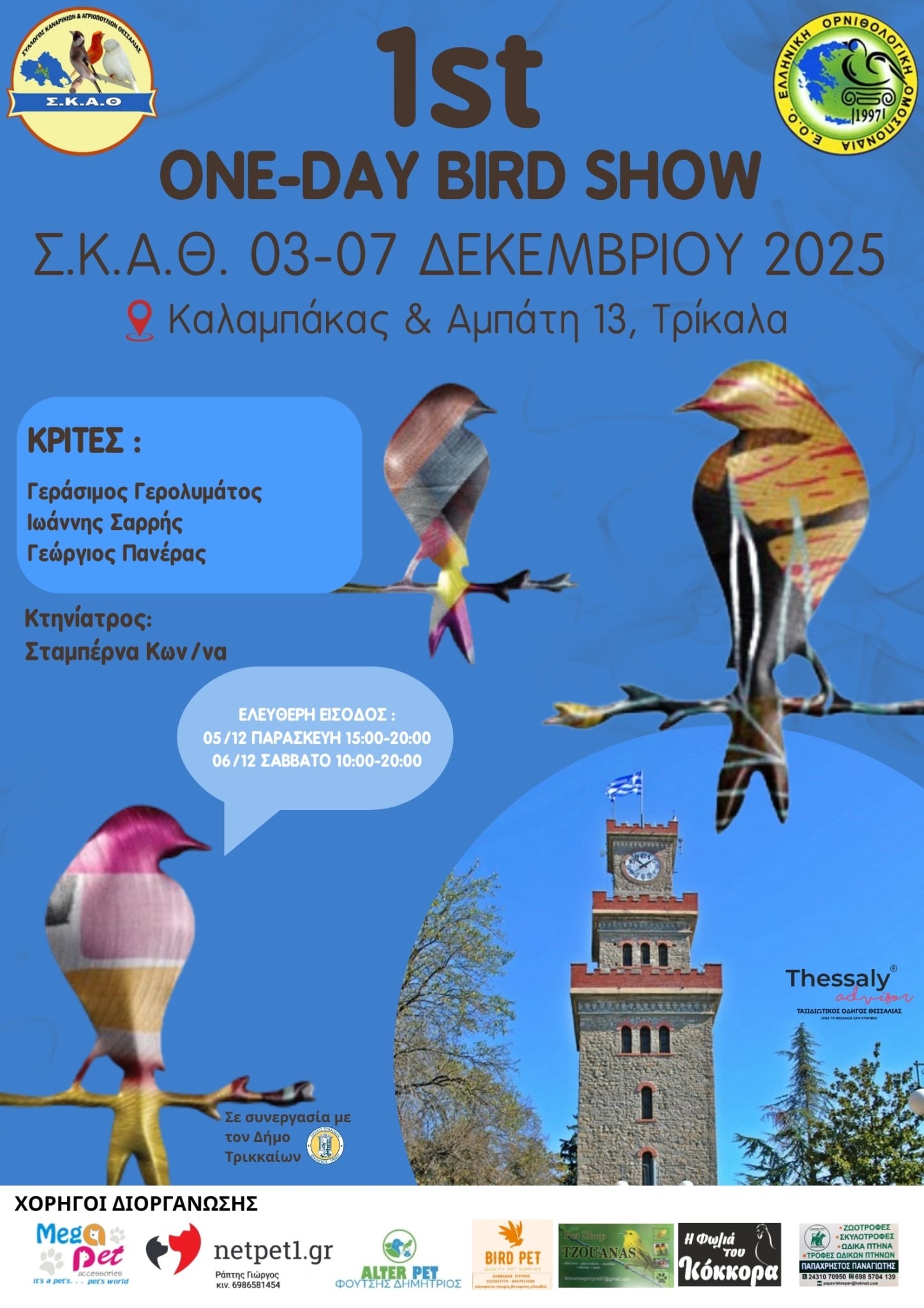 Μια ακόμη σημαντική διοργάνωση για τον Σύλλογο Καναρινιών και Αγριοπουλιών Θεσσαλίας (ΣΚΑΘ) πραγματοποιείται στα Τρίκαλα. Το πενθήμερο 3 έως 7 Δεκεμβρίου 2025 ο ΣΚΑΘ διοργανώνει τον Πρώτο Μονοήμερο Διαγωνισμό Πουλιών (1st One-day BirdShow), στον χώρο δίπλα από το Στ΄ ΚΑΠΗ (Καλαμπάκας και Αμπάτη 13).