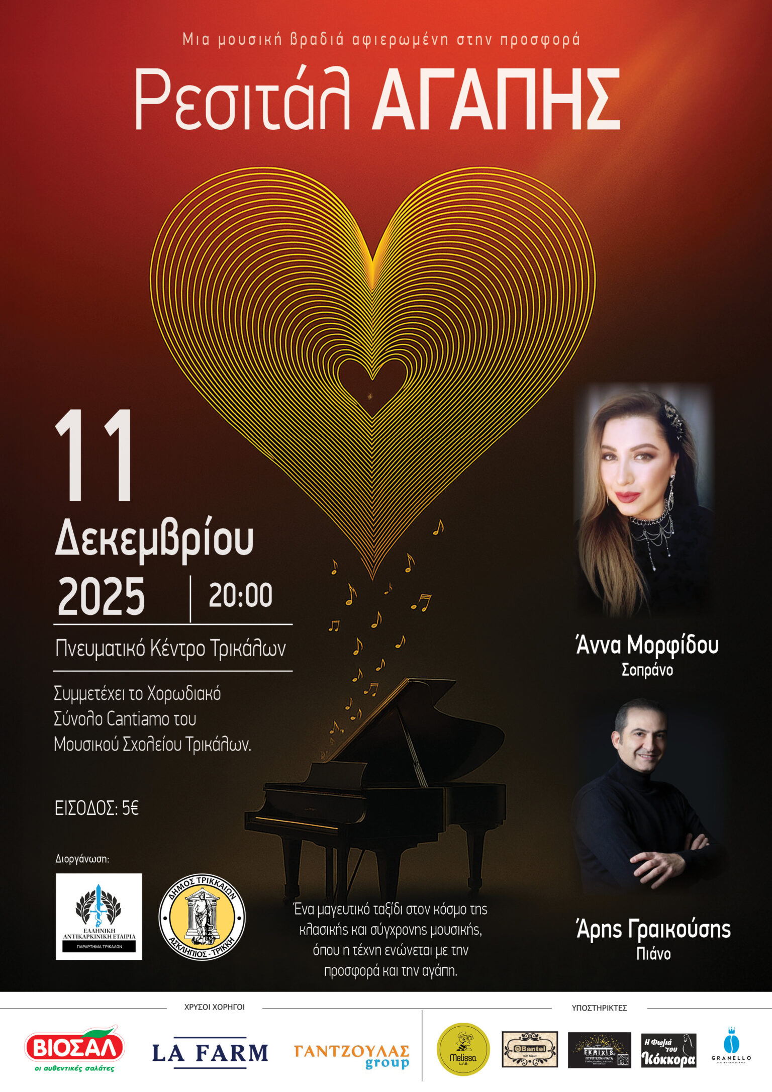 Η Αντικαρκινική Εταιρεία Παράρτημα Τρικάλων, σε συνεργασία με τον Δήμο Τρικκαίων, διοργανώνει μια ξεχωριστή φιλανθρωπική βραδιά με τίτλο «Ρεσιτάλ Αγάπης», όπου η μουσική συναντά την ανθρωπιά και η τέχνη ενώνει τις ψυχές.