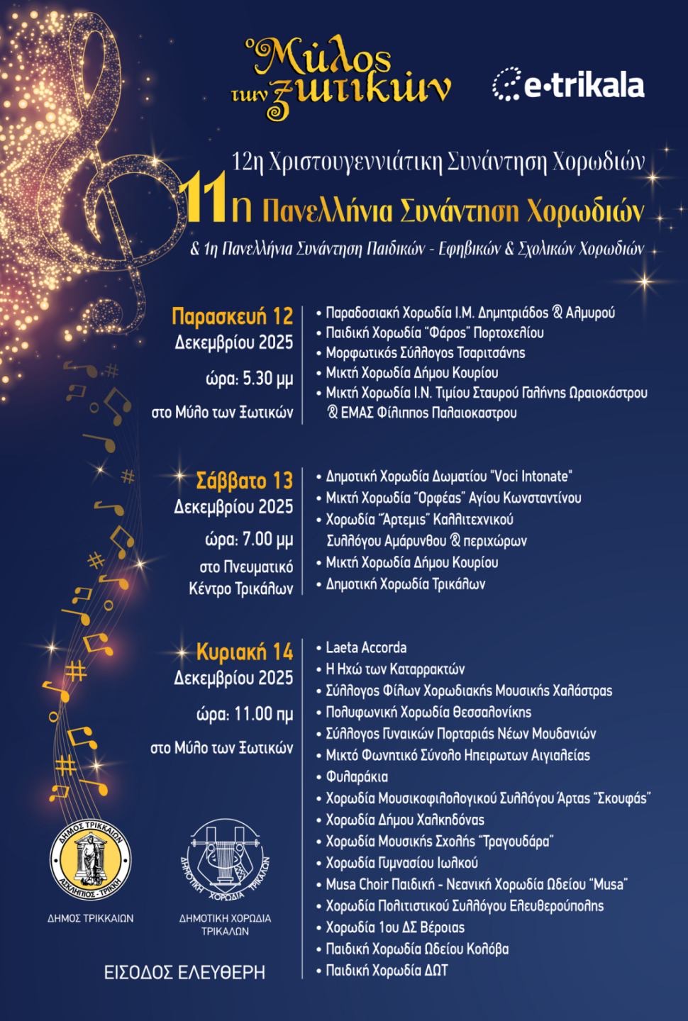 Ο Δήμος Τρικκαίων, η e-trikala και η οργανωτική επιτροπή του Μύλου των Ξωτικών φιλοξενούν και το 2025 πανελλήνιες χορωδιακές συναντήσεις. Με την επιμέλεια και επίβλεψη της Δημοτικής Χορωδίας Τρικάλων το τριήμερο 12, 13 και 14 Δεκεμβρίου 2025 πραγματοποιούνται:
