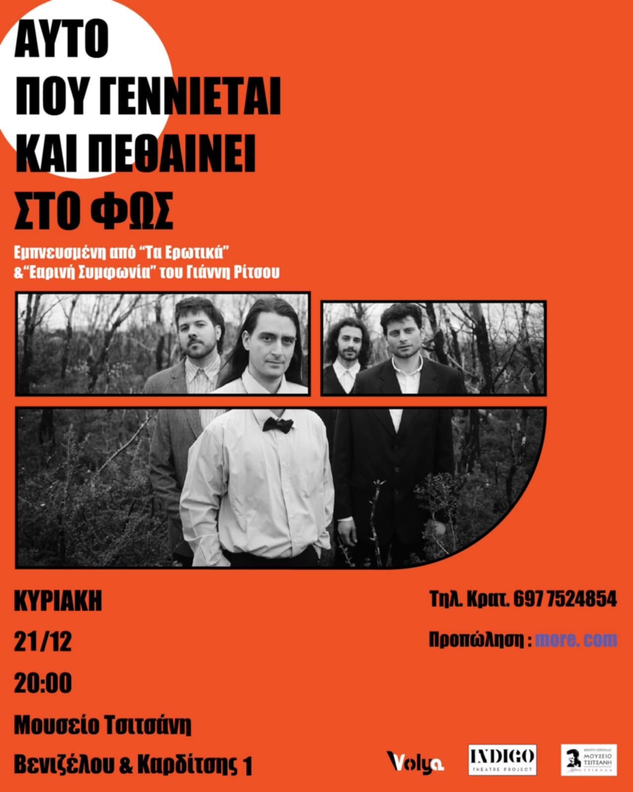 Μια πρωτότυπη θεατρική σύνθεση, βασισμένη στην Εαρινή Συμφωνία και τα Ερωτικά του Γιάννη Ρίτσου, παρουσιάζεται την Κυριακή 21 Δεκεμβρίου 2025 στο Μουσείο Τσιτσάνη. Πρόκειται για την παράσταση με τίτλο «Αυτό που γεννιέται και πεθαίνει στο φως».