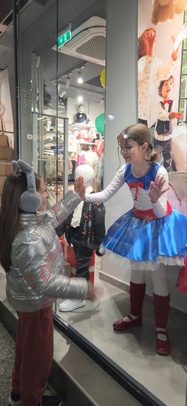Οι βιτρίνες της τοπικής αγοράς έπαψαν να είναι απλώς τζάμια και αντικείμενα και μεταμορφώθηκαν σε μικρές σκηνές φαντασίας. Παιδιά μπήκαν μέσα τους, τις ζωντάνεψαν με σώμα, κίνηση και συναίσθημα και χάρισαν στους περαστικούς μια απρόσμενη εμπειρία χαράς και έκπληξης.