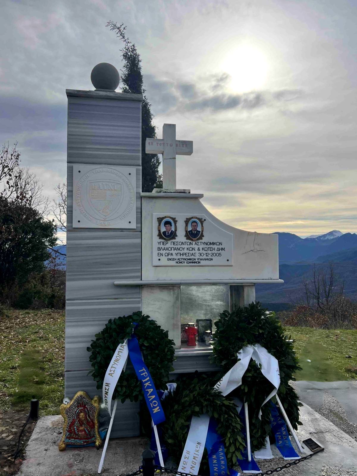 Σήμερα, 30 Δεκεμβρίου 2025, η Ένωση Αστυνομικών Υπαλλήλων Ιωαννίνων και η Ένωση Αστυνομικών Υπαλλήλων Τρικάλων πραγματοποίησαν επιμνημόσυνη δέηση (τρισάγιο) και κατάθεση στεφάνων στην Τρυγόνα Τρικάλων, στο μνημείο που έχει ανεγερθεί από την Ένωση Αστυνομικών Υπαλλήλων Ιωαννίνων προς τιμήν των αείμνηστων συναδέλφων μας Δημήτρη Κώτση και Κωνσταντίνου Βλαχοπάνου, οι οποίοι έχασαν τη ζωή τους κατά την εκτέλεση του καθήκοντος.