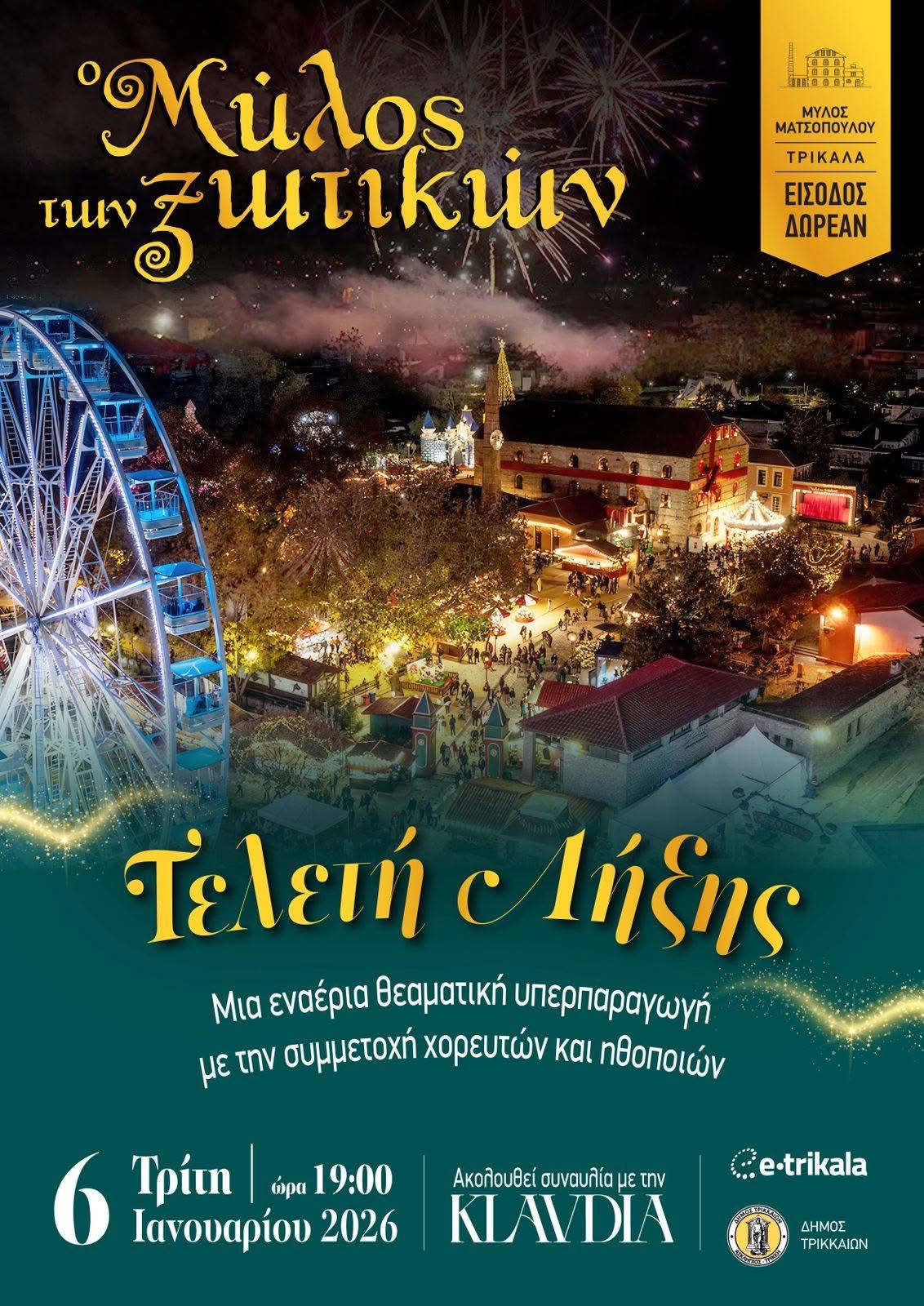 Ο Μύλος των Ξωτικών ολοκληρώνει τη φετινή φωτεινή του πορεία! Η μεγάλη και όμορφη γιορτή κατεβάζει αυλαία την Τρίτη 6 Ιανουαρίου 2026, με την Τελετή Λήξης. Στις 19:00 μια υπερπαραγωγή ετοιμάστηκε για τους χιλιάδες φίλους και φίλες της πιο όμορφης γιορτής, στην πρωτεύουσα των Χριστουγέννων. Και αμέσως μετά, συναυλία με την Κλαυδία!