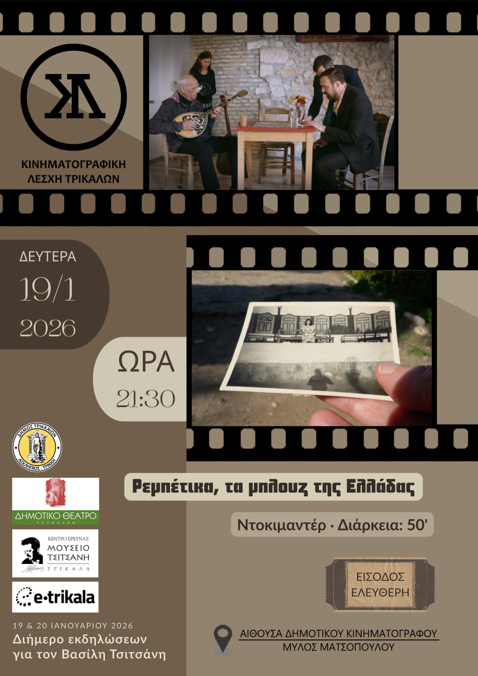Με ντοκιμαντέρ για τα ρεμπέτικα η Κινηματογραφική Λέσχη Τρικάλων συμμετέχει στις διήμερες εκδηλώσεις του Δήμου Τρικκαίων για τον Βασίλη Τσιτσάνη. Πρόκειται για το ντοκιμαντέρ «Ρεμπέτικα, τα μπλουζ της Ελλάδας», παραγωγής 1981, που αποτυπώνει πτυχές και εικόνες των αλλοδαπών για τα ρεμπέτικα, σε συνδυασμό με τα ιστορικά γεγονότα περασμένων δεκαετιών.