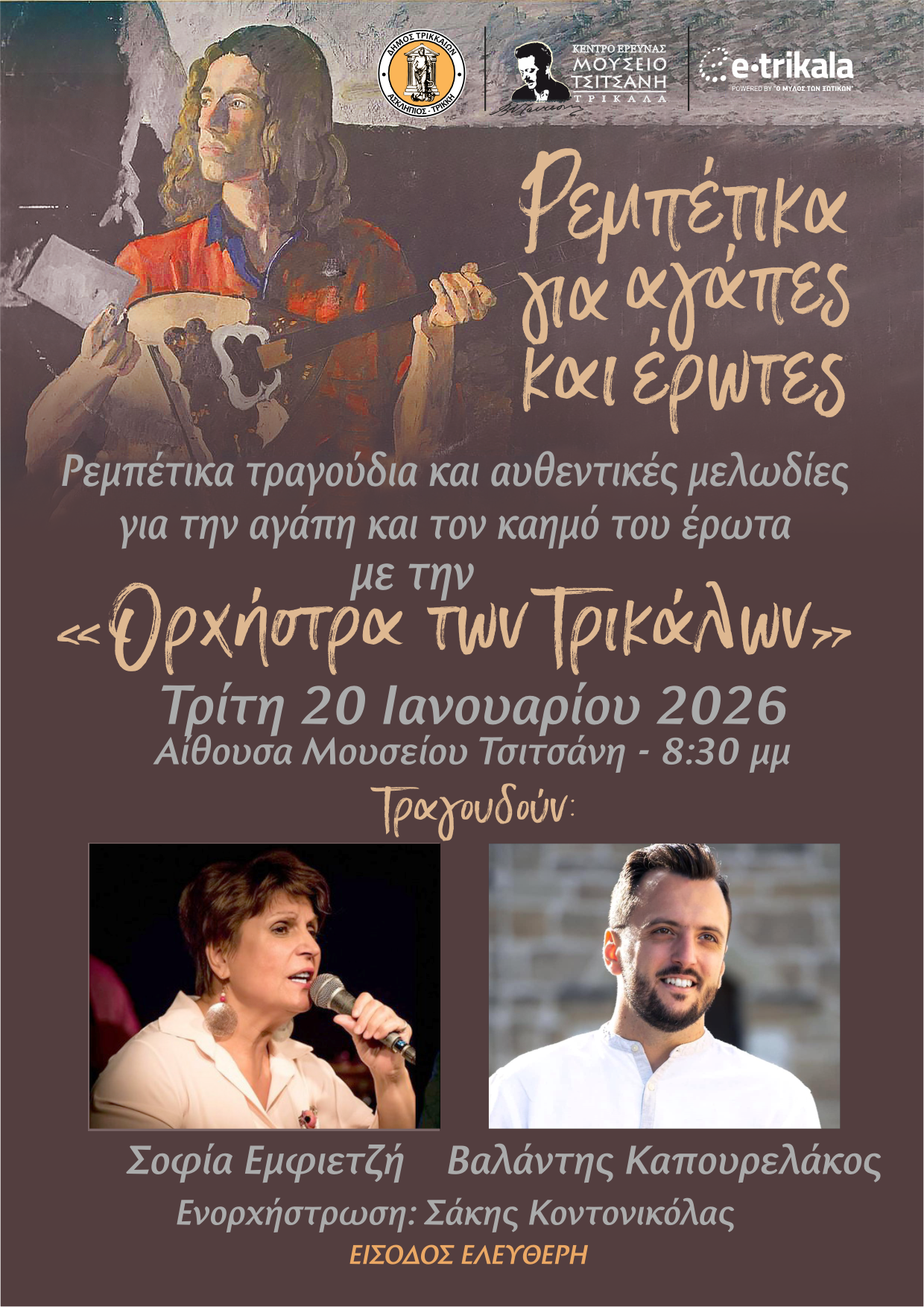 Την Τρίτη 20 Ιανουαρίου στο Μουσείο Τσιτσάνη στις 8:30 μμ , με ελεύθερη είσοδο σας προσκαλούμε να αφεθείτε σε αυτό το μουσικό ταξίδι, να σιγοτραγουδήσετε, να συγκινηθείτε και να θυμηθείτε πως ο έρωτας, όπως και το ρεμπέτικο, είναι πάντα αληθινός, βαθιά ανθρώπινος και διαχρονικός.
