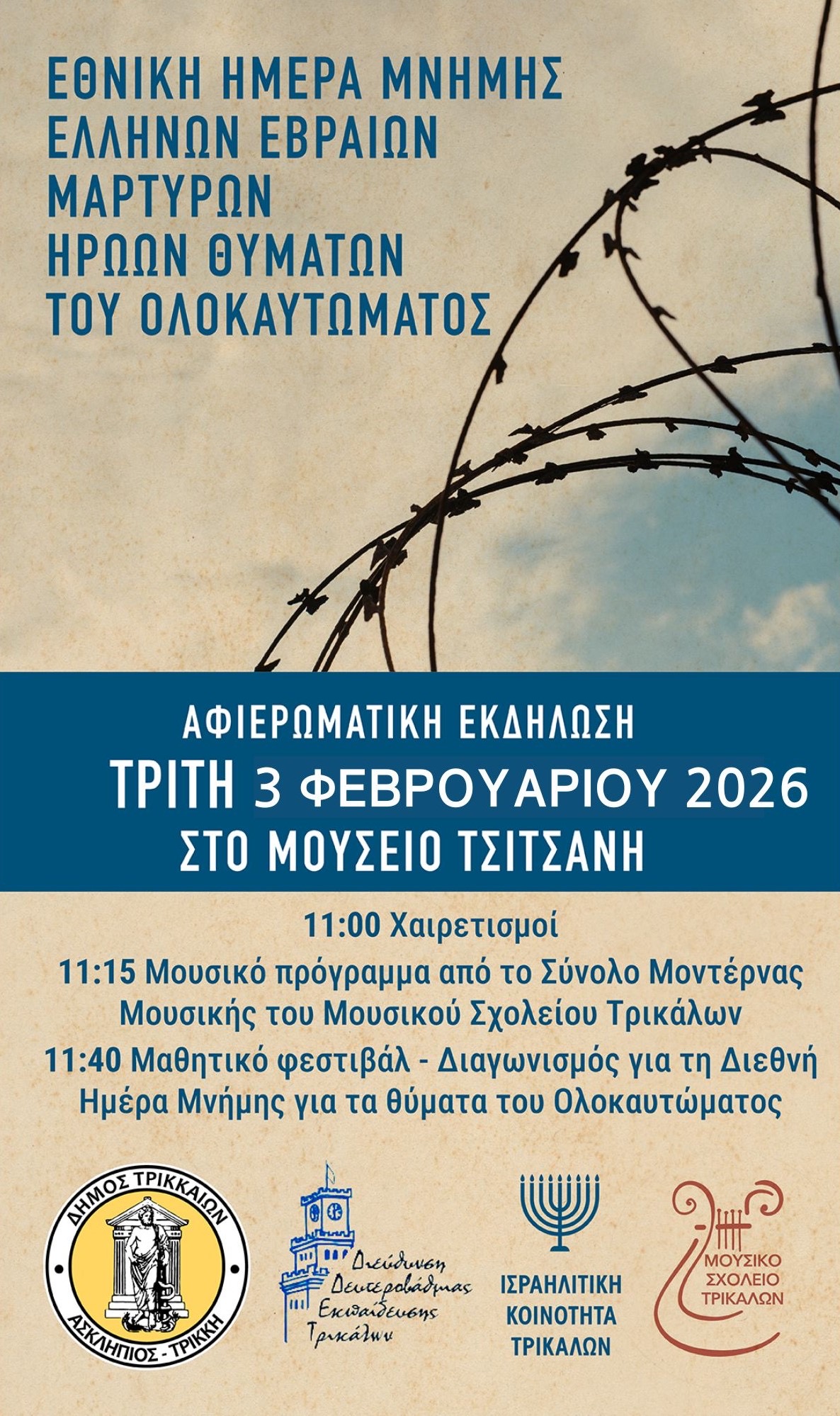 Την Τρίτη 3 Φεβρουαρίου πραγματοποιείται στα Τρίκαλα η αφιερωματική εκδήλωση για την Παγκόσμια Ημέρα Ολοκαυτώματος και την Εθνική Ημέρα Μνήμης Ελλήνων Εβραίων Μαρτύρων Ηρώων Θυμάτων του Ολοκαυτώματος. Η εκδήλωση μεταφέρθηκε αυτήν την ημερομηνία λόγω της τραγωδίας στην εταιρεία ΒΙΟΛΑΝΤΑ