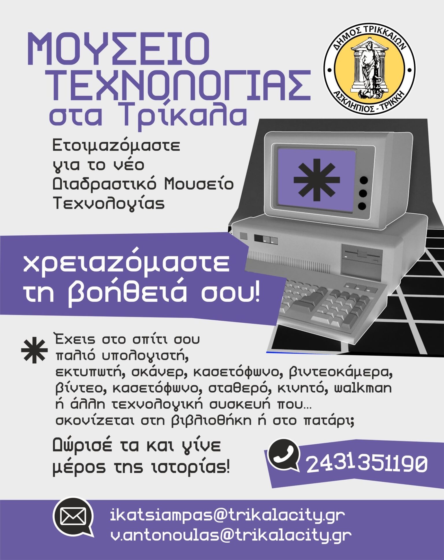 Όσοι/ες επιθυμούν να προσφέρουν αντικείμενα ή να συμβάλουν με οποιονδήποτε τρόπο στη συλλογή, μπορούν να επικοινωνούν με τον Δήμο Τρικκαίων στον τηλεφωνικό αριθμό 2431351190 ή στα emails ikatsiampas@trikalacity.gr και v.antonoulas@trikalacity.gr.