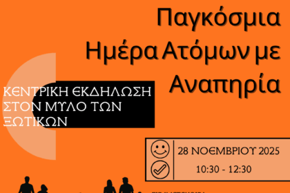 O Μύλος των Ξωτικών με αφορμή την Παγκόσμια Ημέρα Ατόμων με Αναπηρία, που γιορτάζεται παγκόσμια στις 3 Δεκεμβρίου, διοργανώνει μια…