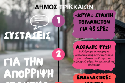 Ιδιαίτερη προσοχή εφιστά και φέτος ο Δήμος Τρικκαίων στην αυθαίρετη και βιαστική απόρριψη στάχτης (από τζάκια ή σόμπες) σε κάδους…